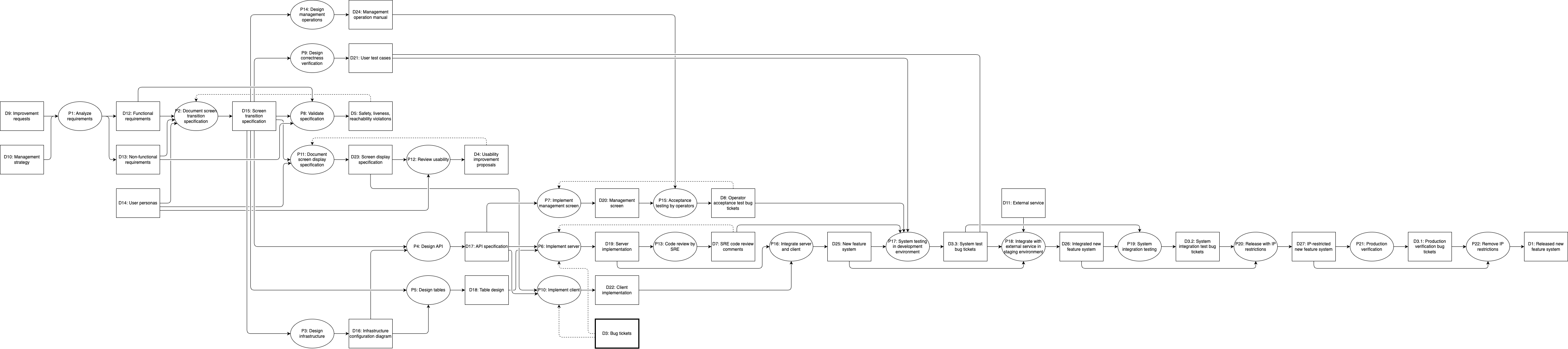 Strictly speaking, a solid arrow from a deliverable to a process means that the process at the arrow’s head cannot be executed unless the deliverable at the arrow’s tail is complete. In contrast, the dashed feedback arrow means that the process at the arrow’s head can be executed even if the deliverable at the arrow’s tail is not yet complete. In other words, implementation can start even without bug tickets, but once bug tickets appear, fixes (re-execution of implementation) are needed.